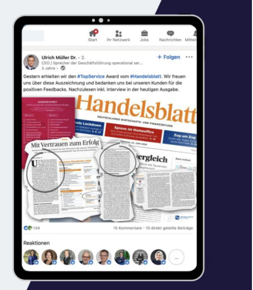 Wirksame Kommunikation durch Gala-Preisverleihung, Handels- blatt-Veröffentlichung und TOP SERVICE Siegel.
